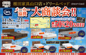 種田家具ZakkaShop&山口店 ドリームベッド サータベッド大商談会開催! 期間は11月8日(土)〜24日(月祝) お得なベッドを探している方、この秋は見逃せません!種田家具ZakkaShop&山口店では、ドリームベッドとの協賛により特別価格の商談会を開催中です。 展示ベッドは約4...